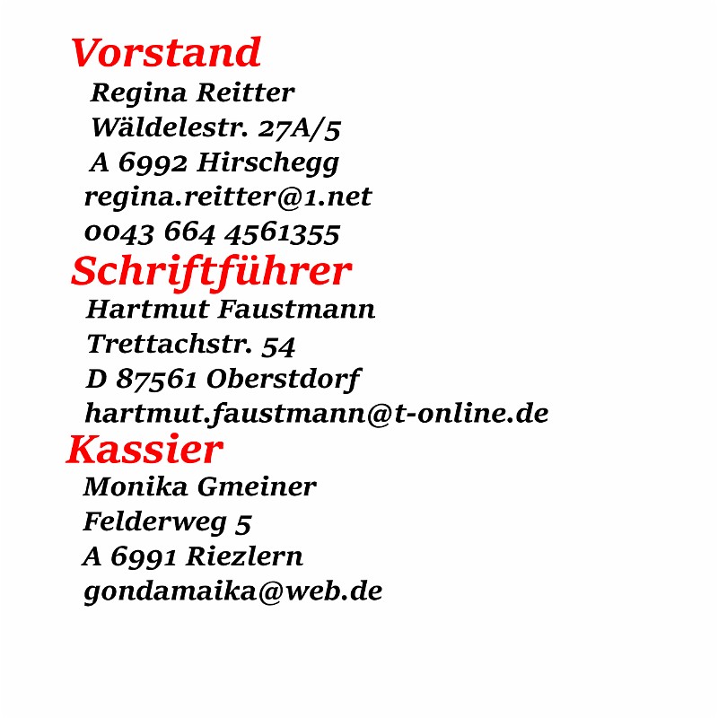 Vorstand: Regina Reitter Schriftführer: Hartmut Faustmann Kassier: Monika Gmeiner Vorstandadressen aktive Mitglieder